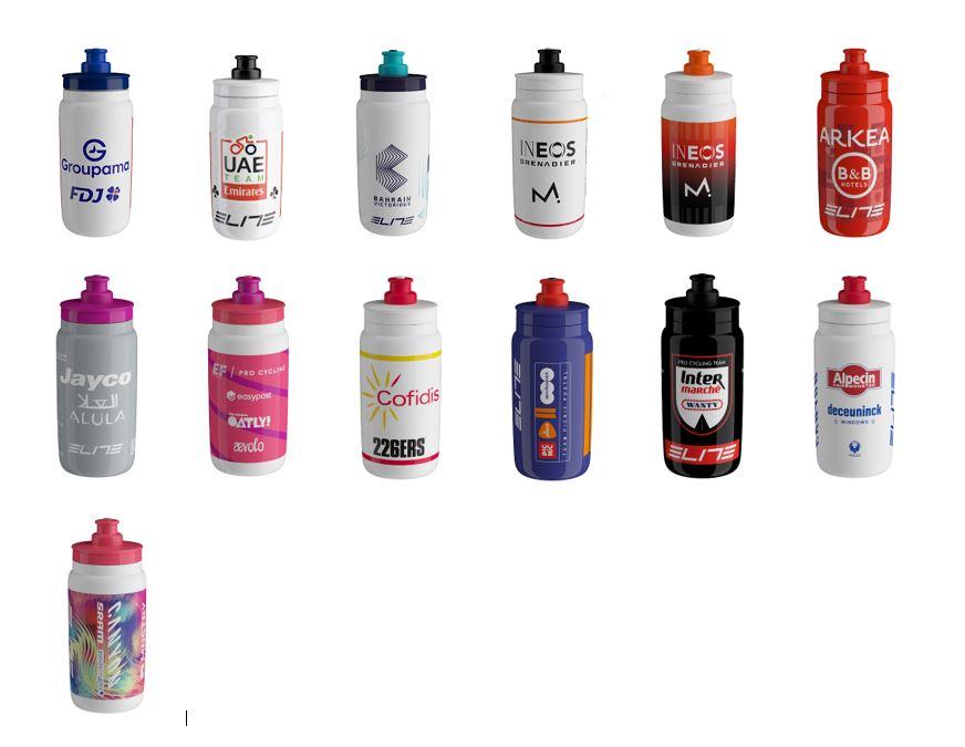 Elite, Trinkflasche, Fly Team, SET FLY TEAM BOTTLES 2025, verschiedene Team Design 2025, 50 FLY TEAM Trinkflaschen: 3 Groupama Fdj + 8 Uae Team Emirates + 3 Bahrain Victorius + 6 Ineos Grenadier White + 6 Ineos Grenadier Style + 3 Arkea B&B Hotels + 3 Team Jayco Alula + 3 Team Ef Pro Cycling Cannondale + 3 Cofidis + 3 Team Picnic Postnl + 3 Intermarche Wanty + 3 Alpecin Deceuninck + 3 Team Canyon Sram, 50x550ml, Ø74mm, Höhe 184,5mm, Kunststoff, Gewicht ca. 51g (pro Flasche)